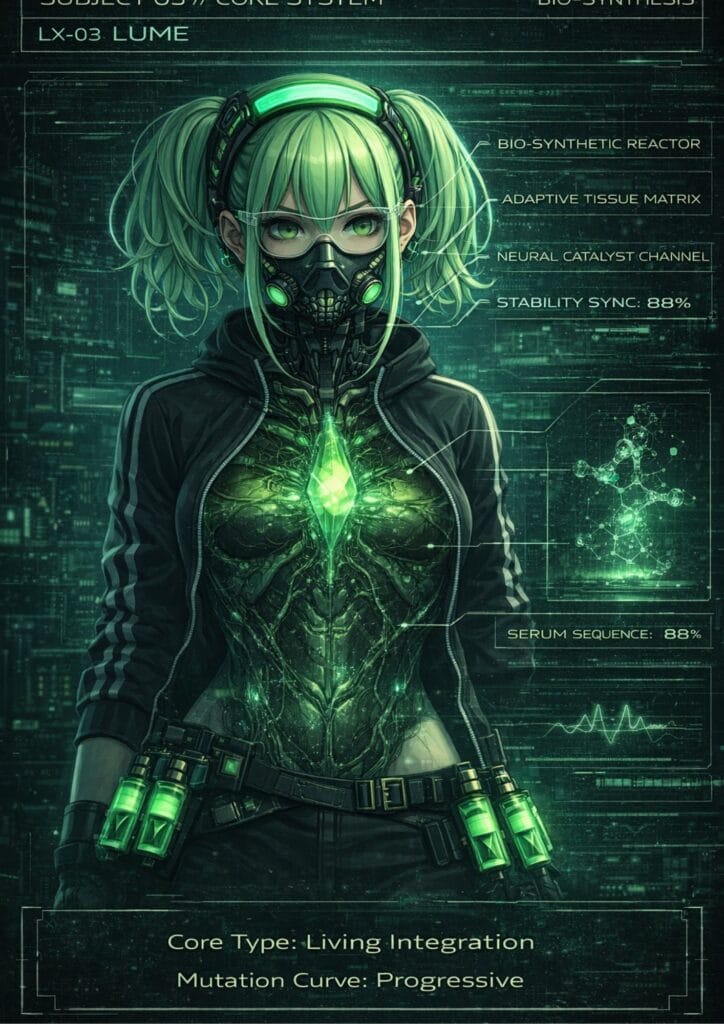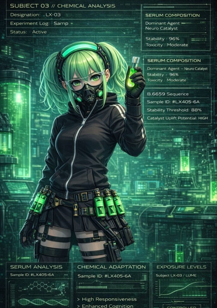 Lume is a traveling alchemist whose work blends forgotten chemistry with relic-based experimentation. She carries a compact kit of glass vials filled with powders, liquids, and unstable mixtures that she prepares herself. To others they are mysterious substances, but to Lume they are carefully balanced reactions waiting to be triggered. Through her alchemy she can transform ordinary materials into volatile compounds, healing agents, or strange crystals that store and release energy.