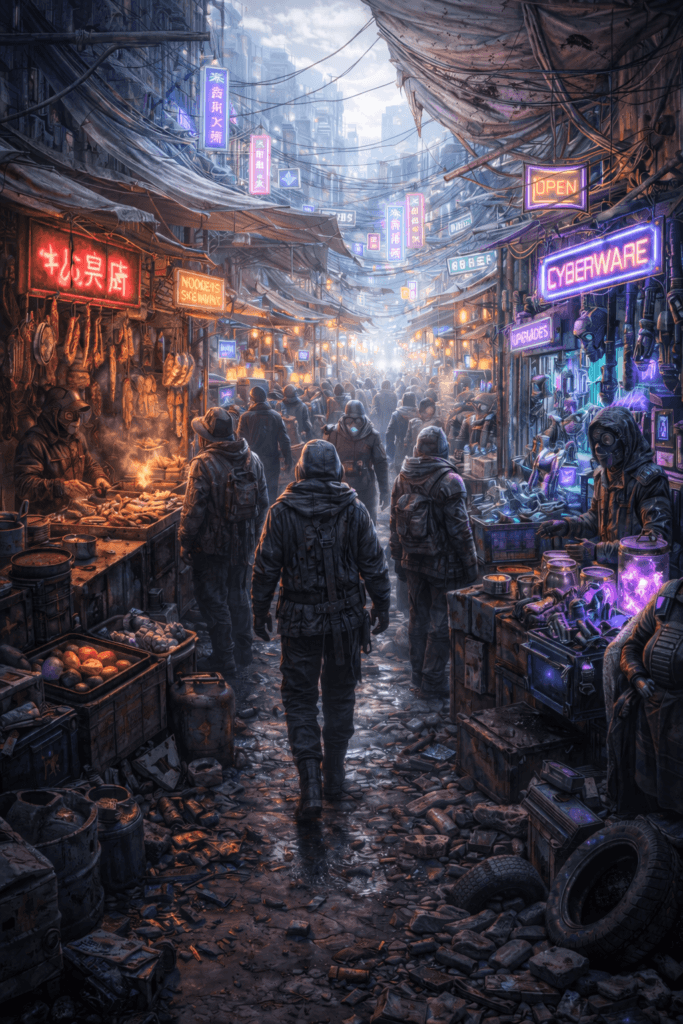 The Market serves independent operators, Subjects, faction enforcers, data couriers, and those who operate beyond conventional authority. Buyers are not civilians, and sellers are rarely identifiable. Transactions prioritize anonymity, reputation, and verified performance over legality or branding. Trust is enforced by consequence, not policy.